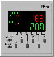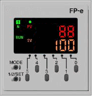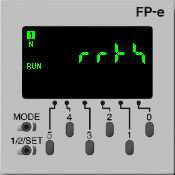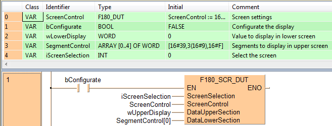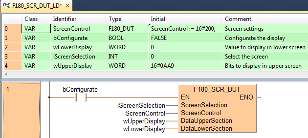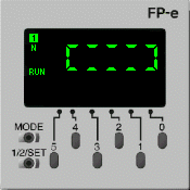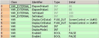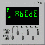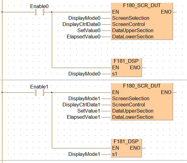 END_VARLorsque la variable Enable0 est sur TRUE, la fonction est exécutée et le FP-e passe en mode N, 1er écran. ElapsedValue0 et SetValue0 sont affichées dans la zone supérieure et la zone inférieure en rouge et orange. Lorsque la variable Enable1 est sur TRUE, la fonction est exécutée et FP-e passe en mode N, 2e écran. ElapsedValue1 et SetValue1 sont affichées dans la zone supérieure et la zone inférieure en rouge et orange. L’icône de monitoring des valeurs est activé pour les deux corps LD. Utilisez l’instruction F181_DSP pour modifier l’affichage de FP-e.