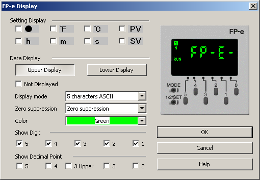 END_IF;Cette boîte de dialogue facilite la configuration de l’affichage de l’écran de FP-e. Vous pouvez voir le résultat de votre configuration directement grâce à l’affichage sur la boîte de dialogue. Les paramètres individuels de l’affichage de l’écran sont indiqués avec les données de contrôle s2.