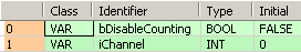 END_VARLorsque la variable bDisableCounting passe de FALSE à TRUE, le comptage sur la voie spécifiée par iChannel est désactivé.