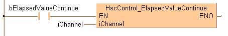 Cette instruction continue le comptage sur la voie spécifiée par iChannel après réinitialisation de la valeur courante à l’aide de HscControl_ElapsedValueReset. Le bit 0 de Écrire le code de contrôle du compteur rapide est défini sur FALSE.