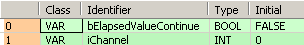 END_VARLorsque la variable bElapsedValueContinue est définie sur TRUE, le comptage continue sur la voie spécifiée par iChannel.