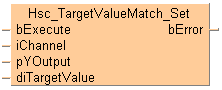 Lorsque la valeur courante correspond à la valeur de consigne diTargetValue de la voie du compteur rapide spécifiée par iChannel, le drapeau de sortie spécifié par pYOutput devient immédiatement TRUE.