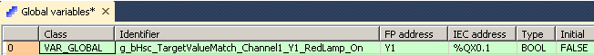 Utilisez HscInfo_IsActive pour contrôler la voie spécifiée par iChannel1. Lorsqu’un front montant est détecté sur bSet et lorsque bIsActive n’est pas TRUE, l’instruction est exécutée. La combinaison du numéro de voie et du contact de sortie est validée dans la variable globale g_bHsc_TargetValueMatch_Channel1_Y1_RedLamp_On. Lorsque le compteur rapide sur la voie 1 atteint la valeur de consigne diTargetValue0, la sortie Y1 devient TRUE.
