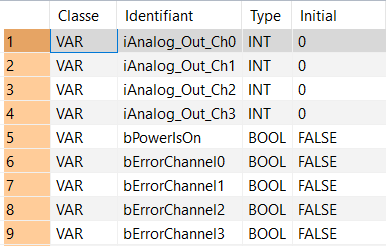 END_VARLes valeurs numériques entrées à iOutChannel0–iOutChannel3 sont écrites vers le module analogique et converties en valeurs analogiques. Les données analogiques sont sorties aux voies de sorties correspondantes.