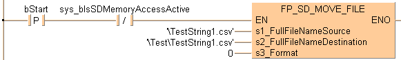 END_VARLorsque la variable bStart passe de FALSE à TRUE et lorsque la variable système sys_bIsSDMemoryAccessActive n’est pas TRUE, la fonction est exécutée. Elle déplace le fichier 'TestString1.csv' du répertoire racine de la carte mémoire SD vers le répertoire 'Test'.