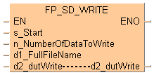 Cette instruction FP lit le nombre de données, spécifié par n_NumberOfDataToWrite, qui sont sauvegardées à l’adresse à partir de s_Start et écrit les données dans le fichier spécifié par d1_FullFileName sur la carte mémoire SD. Le DUT FP_SD_WRITE_DUT à d2_dutWrite indique les paramètres d’écriture.