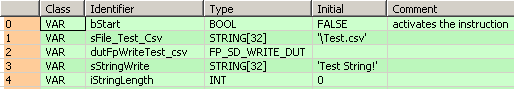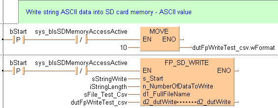 END_VARLorsque la variable bStart passe de FALSE à TRUE et lorsque la variable système sys_bIsSDMemoryAccessActive n’est pas TRUE, la fonction est exécutée.