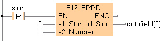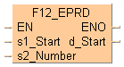Cette instruction permet de copier des données de la mémoire EEPROM/ Flash-ROM vers une zone de destination (DT). Seuls des blocs peuvent être copiés. Vous ne pouvez pas copier des mots séparément. La taille des blocs et le nombre de blocs sont indiqués dans le tableau "Informations spécifiques aux automates". Vérifiez également qu’au moins 64/ 2048 registres de données disponibles (1 bloc = 64 mots/ 2048 mots (DT)) sont réservés dans la zone de destination.
