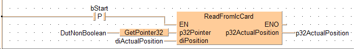 La fonction ReadFromIcCard est exécutée lorsque la variable bStart passe de FALSE à TRUE. La fonction lit les valeurs sur la carte CI à partir de l’adresse diActualPosition et écrit les informations dans la variable DutNonBoolean. Veillez à ce que la carte CI soit formatée correctement via le menu et à ce que les valeurs à partir de l’adresse diActualPosition soient disponibles sur la carte CI.