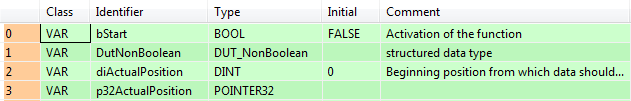 Toutes les variables d’entrée et de sortie utilisées pour programmer cette fonction ont été déclarées dans l’en-tête du POU. Le même en-tête de POU est utilisé pour tous les langages de programmation.