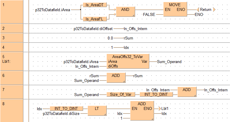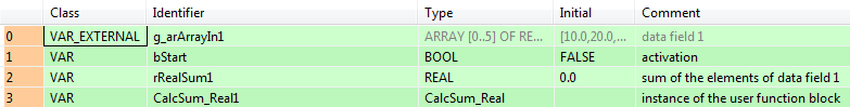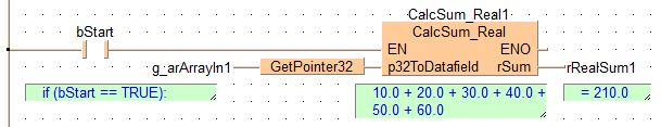 END_VARLorsque la variable bSart est sur TRUE, le bloc fonction CalcSum_REAL est exécuté. Il calcule la somme de tous les éléments de la zone de données RealArrayIn1 et écrit le résultat sur la variable RealSum1.