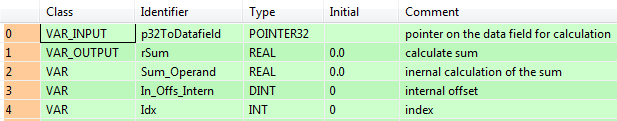 Les variables RealArrayIn1 et RealArrayIn2 sont affectées. Elles sont délibérément déclarées dans différentes zones mémoires afin de démontrer l’efficacité du bloc fonction CalcSum_REAL. Les variables peuvent également être déclarées dans l’en-tête du POU du programme Program_CalcSums.
