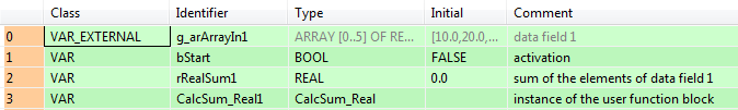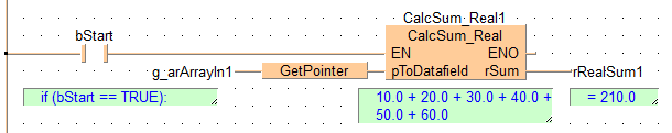 END_VARLorsque la variable bStart est sur TRUE, le bloc fonction CalcSum_REAL est exécuté. Il calcule la somme de tous les éléments de la zone de données g_arArrayIn1 et écrit le résultat sur la variable rRealSum1.