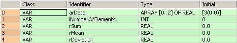 end_for;La fonction FunCalcStatistics1, définie par l’utilisateur, calcule les statistiques à partir des valeurs désignées par prArray. L’instruction AreaOffs_ToVar est utilisée en interne à partir des zones d’adresses des données externes.