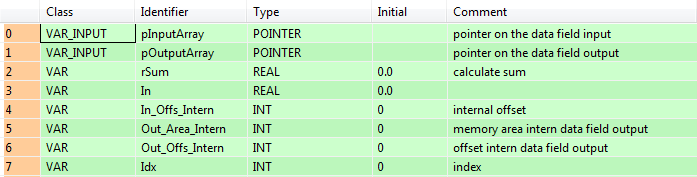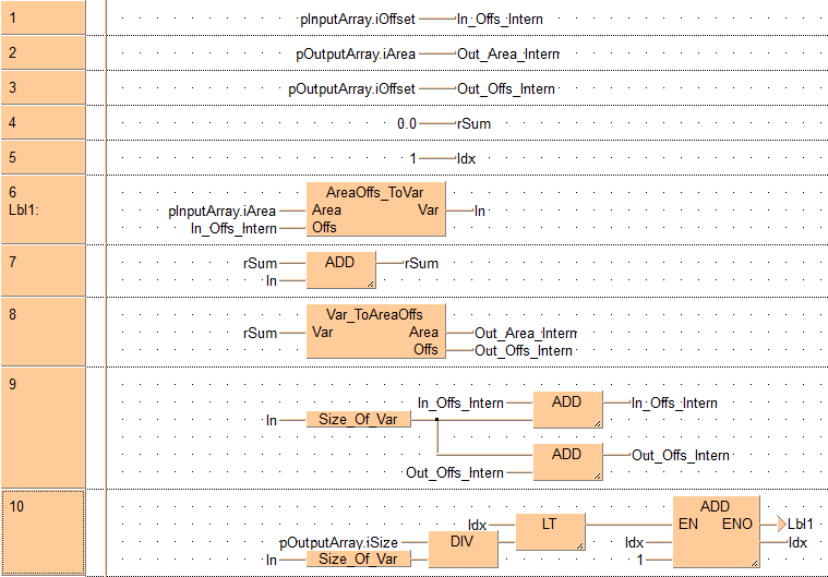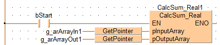 END_VARLorsque la variable bStart est sur TRUE, le bloc fonction CalcSum_REAL est exécuté. Il calcule la somme de tous les éléments de la zone de données g_arArrayIn1 et écrit le résultat sur la zone de données g_arArrayOut1. De cette façon, le premier élément de g_arArrayOut1 reçoit le premier élément de g_arArrayIn1. Le deuxième élément de g_arArrayOut1 contient les sommes du premier, deuxième et troisième élément de g_arArrayIn1.Le troisième élément de g_arArrayOut1 contient les sommes du premier, deuxième et troisième élément de g_arArrayIn1.....