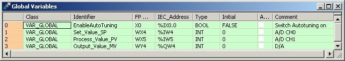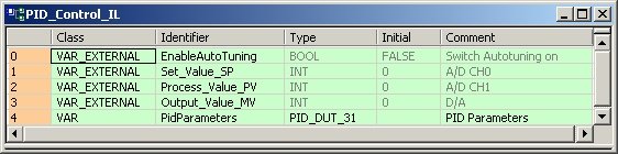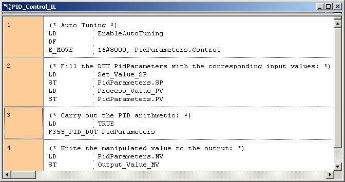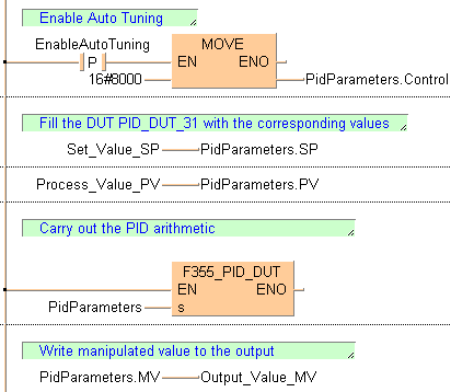 END_VARLorsque la variable PidParameters du type de données PID_DUT_31 est initialisée, la limite supérieure MV est de 4000. Initialement, le gain proportionnel Kp est défini à 80 (8), Ti et Td à 200 (20s) et le temps d’échantillonnage Ts à 100 (1s).