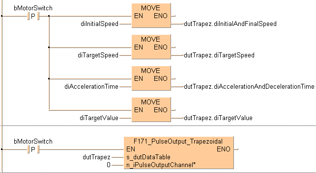 Utilisez le DUT prédéfini suivant : F171_PulseOutput_Trapezoidal_Type0_DUT (vitesse maximale = première vitesse de consigne) ou F171_PulseOutput_Trapezoidal_Type1_DUT (vitesse maximale = 50kHz).