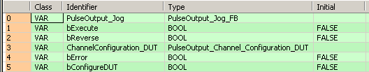 B(B_FB,PulseOutput_Jog_FB!,PulseOutput_Jog,15,1,28,10,,?BbExecute?BbReverse?BdiInitialAndFinalSpeed?BdiTargetSpeed?BdiAccelerationTime?BdiDecelerationTime?BdutChannelConfiguration?AbError);