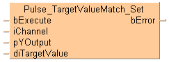 Lorsque la valeur courante correspond à la valeur de consigne diTargetValue de la voie de sortie impulsionnelle spécifiée par iChannel, le drapeau de sortie spécifié par pYOutput devient immédiatement TRUE.