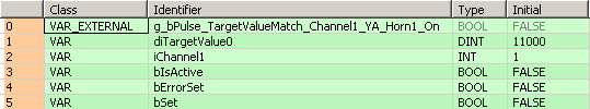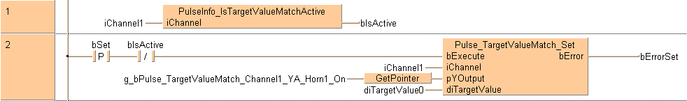 Utilisez PulseInfo_IsTargetValueMatchActive pour vérifier si la voie iChannel1 est active. Lorsqu’un front montant est détecté sur bSet et lorsque bIsActive n’est pas TRUE, l’instruction est exécutée. La combinaison du numéro de voie et du contact de sortie est validée dans la variable globale g_bPulse_TargetValueMatch_Channel1_YA_Horn1_On. Lorsque la sortie impulsionnelle sur la voie 1 atteint la valeur de consigne diTargetValue0, la sortie YA devient TRUE.