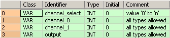 END_VARDans cet exemple, les variables d’entrée (channel_select, channel_0 et channel_1) ont été déclarées. Vous pouvez aussi entrer directement une constante au contact d’entrée d’une fonction.