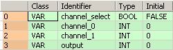END_VARDans cet exemple, les variables d’entrée (channel_select, channel_0 et channel_1) ont été déclarées. Vous pouvez aussi entrer directement une constante au contact d’entrée d’une fonction.