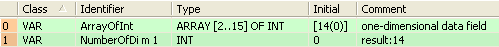 END_VARDans ce cas, la fonction Elem_OfArray1D est exécutée à chaque cycle de l’unité centrale (sans entrée EN). Elle détermine le nombre d’éléments de la variable ArrayOfInt. Le résultat est le suivant : NumberOfDim1 = 14.