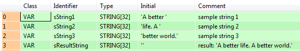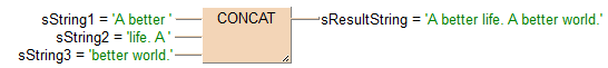 END_VARDans cet exemple, les variables d’entrée (sString1, sString2 et sString3) ont été déclarées. Cependant, vous pouvez entrer la chaîne de caractères directement dans la fonction. Les chaînes de caractères doivent être entrées entre guillemets, à la fois dans l’en-tête du POU et dans la fonction.
