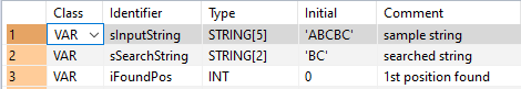 END_VARDans cet exemple, les variables d’entrée sInputString et sSearchString ont été déclarées. Vous pouvez également entrer les chaînes de caractères ('ABCBC.' et 'BC') directement dans la fonction. Les chaînes de caractères doivent être entrées entre guillemets, à la fois dans l’en-tête du POU et dans la fonction.
