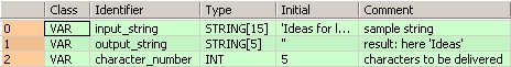 END_VARDans cet exemple, les variables d’entrée input_string et character_number ont été déclarées. Vous pouvez également entrer la chaîne de caractères ('Ideas for life') et le nombre de caractères devant être copiés directement dans la fonction. La chaîne de caractères doit être entrée entre guillemets, à la fois dans l’en-tête du POU et dans la fonction.
