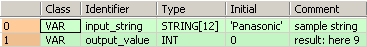 END_VARDans cet exemple, la variable d’entrée (input_string) a été déclarée. Vous pouvez également entrer la chaîne de caractères ('Panasonic') directement dans la fonction. La chaîne de caractères doit être entrée entre guillemets, à la fois dans l’en-tête du POU et dans la fonction.