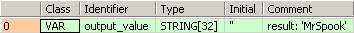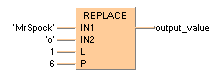END_VARDans cet exemple, les valeurs constantes sont entrées directement aux contacts d’entrée de la fonction. Cependant, vous pouvez également déclarer les variables dans l’en-tête du POU. Les chaînes de caractères doivent être entrées entre guillemets, soit dans l’en-tête du POU soit aux contacts d’entrée. Dans la chaîne de caractères 'MrSpock', le 'c' a été remplacé par un 'o', donnant 'MrSpook'.