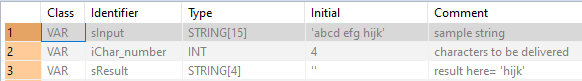 END_VARDans cet exemple, les variables d’entrée sInput et iChar_number ont été déclarées. Vous pouvez également entrer la chaîne de caractères ('abcd efg hijk') et le nombre de caractères devant être copiés directement dans la fonction. La chaîne de caractères doit être entrée entre guillemets, à la fois dans l’en-tête du POU et dans la fonction.