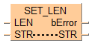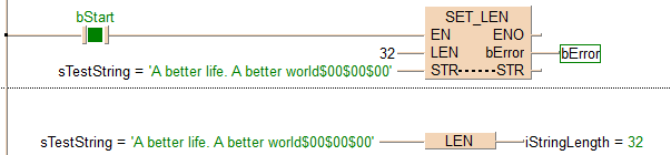 Cette instruction définit une nouvelle longueur de chaîne de caractères en entrée LEN pour la chaîne de caractères en entrée STR. Si la nouvelle longueur est supérieure à la longueur maximale de la chaîne de caractères déclarée, une erreur apparaît et bError passe à TRUE. Si vous définissez une longueur de chaîne de caractères inférieure à la longueur actuelle, la chaîne de caractères sera tronquée selon la nouvelle longueur de chaîne de caractères.