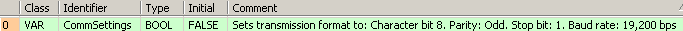 END_VARLorsque CommSettings est activé, le format et la vitesse de transmission du port COM1 sont définis de la façon suivante : Taille des données : 8 ; Parité : impaire ; bit de stop : 1 ; vitesse de transmission : 19 200 bps.