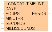 CONCAT_TIME_INT concatène les valeurs INTEGER pour les jours, heures, minutes, secondes et millisecondes. Le résultat est sauvegardé dans la variable de sortie du type de données TIME. La sortie booléenne ERROR est activée si les valeurs d’entrée sont des valeurs de date et heure invalides.