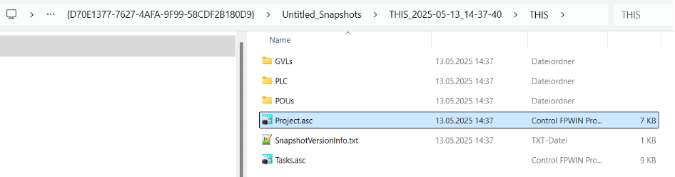 Dans tous les cas, Control FPWIN Pro7 crée un dossier pour les captures instantanées et les fichiers de comparaison à l’endroit spécifié par le chemin d’accès au projet. Le nom du dossier se compose du nom du projet, le type de capture instantanée, l’horodatage (pas obligatoirement dans cet ordre), par ex. <project name>_Snapshots\<snapshot type>_yyyy-mm-dd_hh-mm-ss.