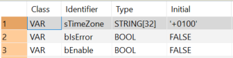 Cette instruction FP est nécessaire uniquement si vous souhaitez définir temporairement un fuseau horaire local dans l’automate pour remplacer le fuseau horaire défini par le registre système sous . Ce fuseau horaire local est spécifié par sTimeZone et il est utilisé en combinaison avec l’heure fournie par FP_NTP_SYNCHRONIZE.