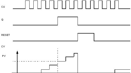 Le compteur croissant démarre à zéro jusqu’à ce que la valeur maximale 32767 soit atteinte. À chaque front montant du compteur croissant CU, la valeur courante CV est incrémentée de 1.