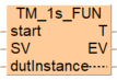 Fonction définie par l’utilisateur, créée à partir d’un bloc fonction système converti. Ce temporisateur à intervalles de 1s fonctionne comme un temporisateur avec retard à l’activation. Lorsque le contact start de la fonction est activé, le temps prédéfini SV (set value) est décompté. Quand la durée s’est écoulée, le contact T du temporisateur est activé.