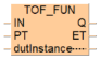 Fonction définie par l’utilisateur, créée à partir d’un bloc fonction système converti. La fonction TOF_FUN permet de programmer un retard à la désactivation, par ex. pour éteindre le ventilateur d’une machine après la machine elle-même.