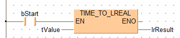 TIME_TO_LREAL convertit une valeur du type de données TIME en une valeur du type de données LREAL. 10ms du type de données TIME correspond à une unité REAL de 1.0, par ex. lorsque TIME = 10ms, REAL = 1.0 ; et lorsque TIME = 1s, REAL = 100.0. La résolution est de 10ms.