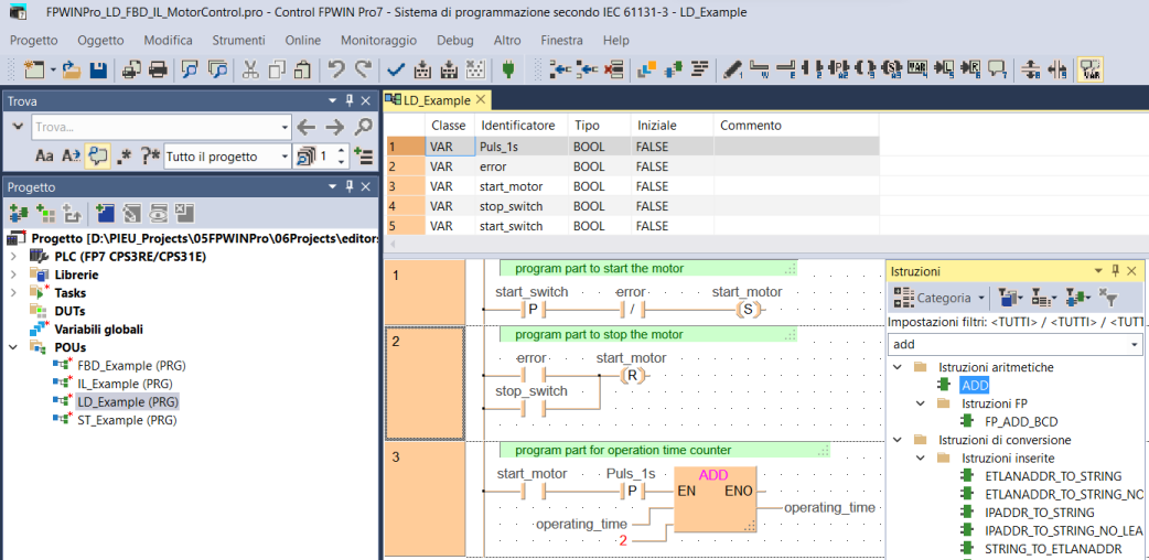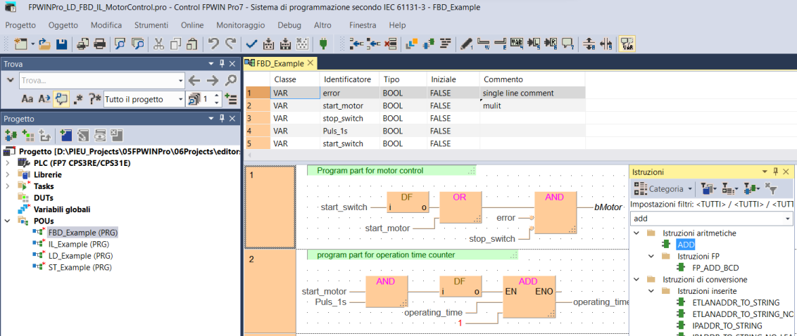 FBD utilizza elementi di programmazione simili ma non include una linea di alimentazione, contatti e bobine. In questa sezione, se non diversamente specificato, gli esempi e le descrizioni si riferiscono al linguaggio LD.