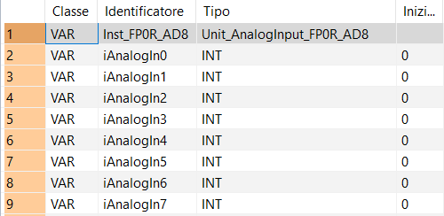 Questo Function Block legge i valori digitali convertiti dai canali ingresso analogico dell'unità analogica. I valori digitali convertiti dall'unità analogica vengono salvati per canale nelle variabili di uscita da iInChannel0 a iInChannel7.