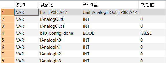 CPUに直接接続されているアナログ増設ユニット(アダプタなし)の場合: ExpansionUnitToIOWordOffset_FP0を使用するか、以下の設定を行います。ユニット番号1は2 (WX2/WY2)、ユニット番号2は4 (WX4/WY4)、ユニット番号3は6 (WX6/WY6)。
